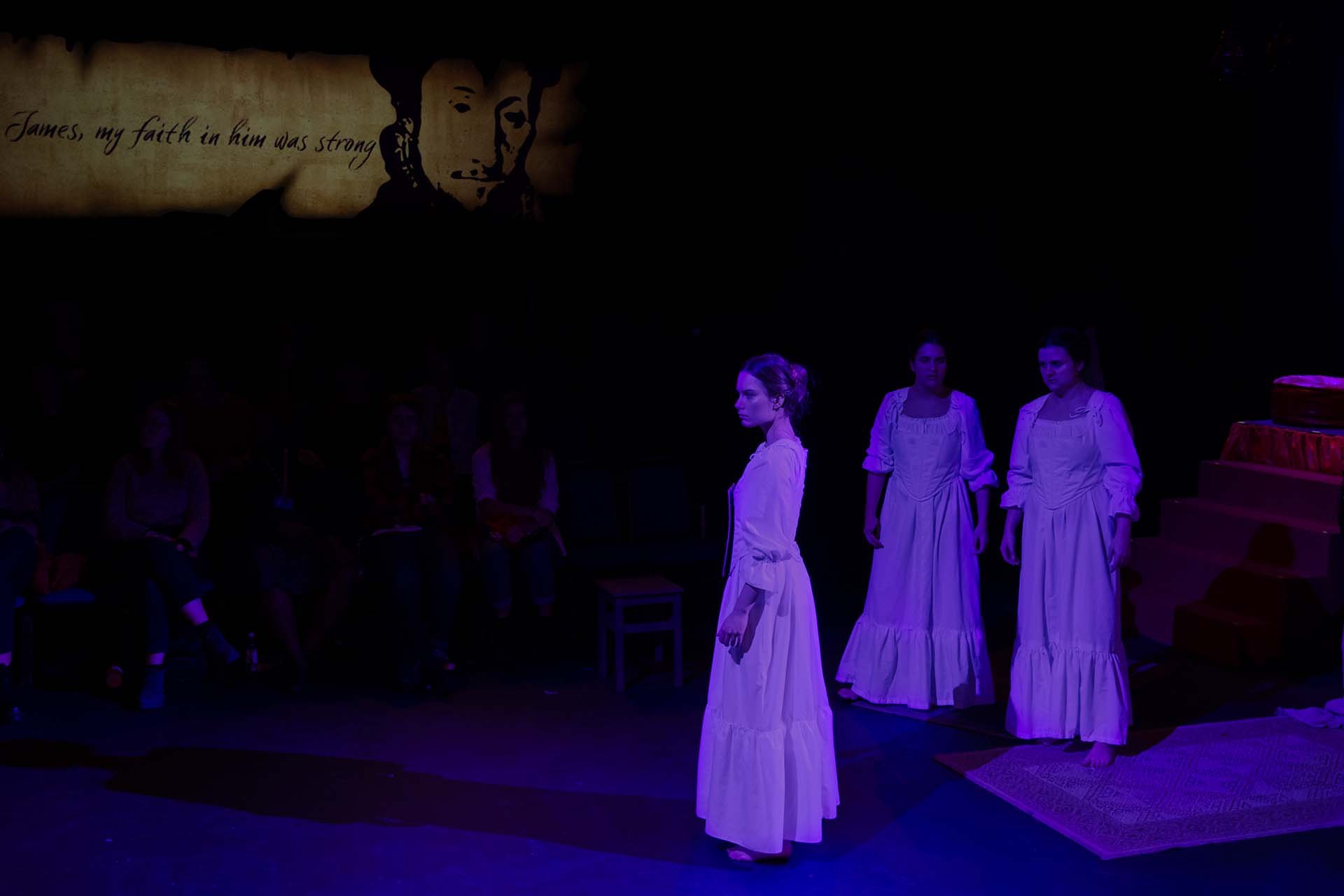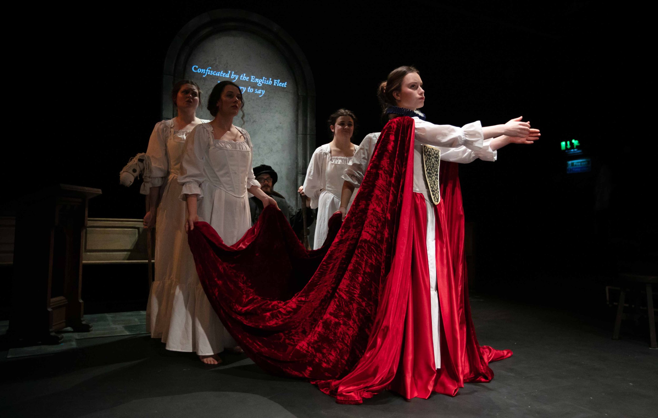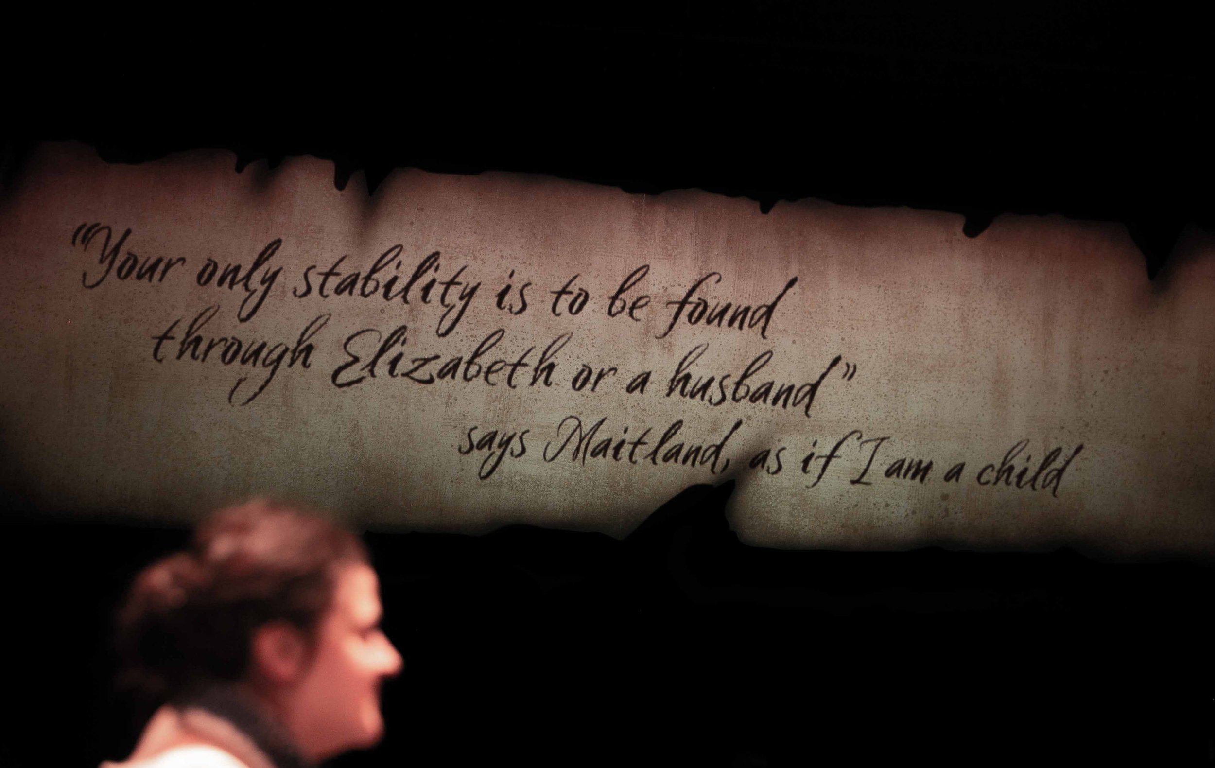 Letters to Bess - a simulated excerpt of the scene. Pictured centre is Queen Elizabeth I (Claire Wetherall). She is facing Mary Queen of Scots across stage as she reads her letter, with her back to Knox, whose letters she also reads in the scene. Original image by Robert McFadzean (silent)