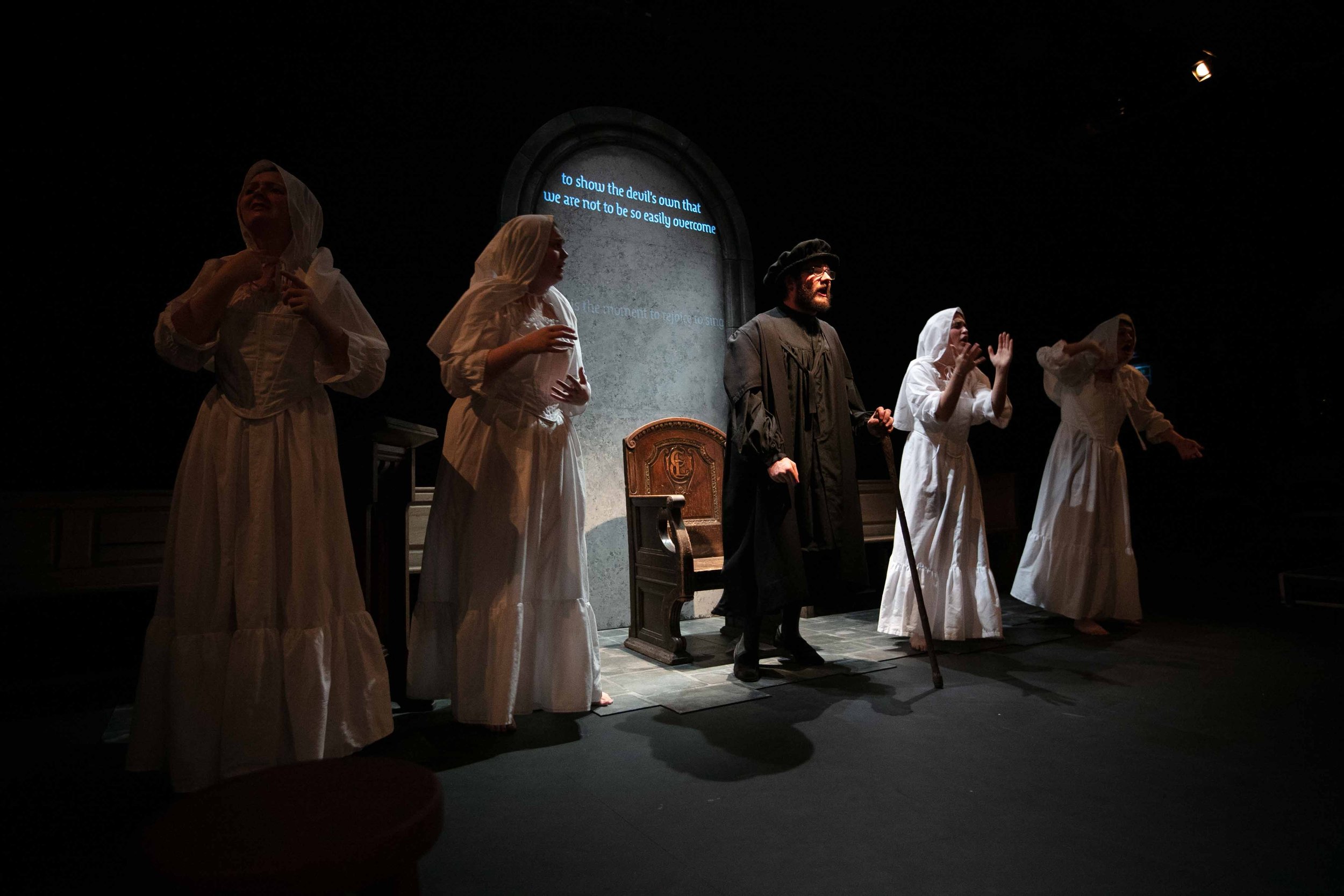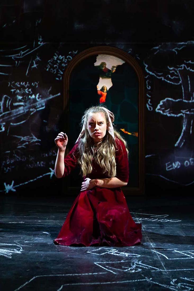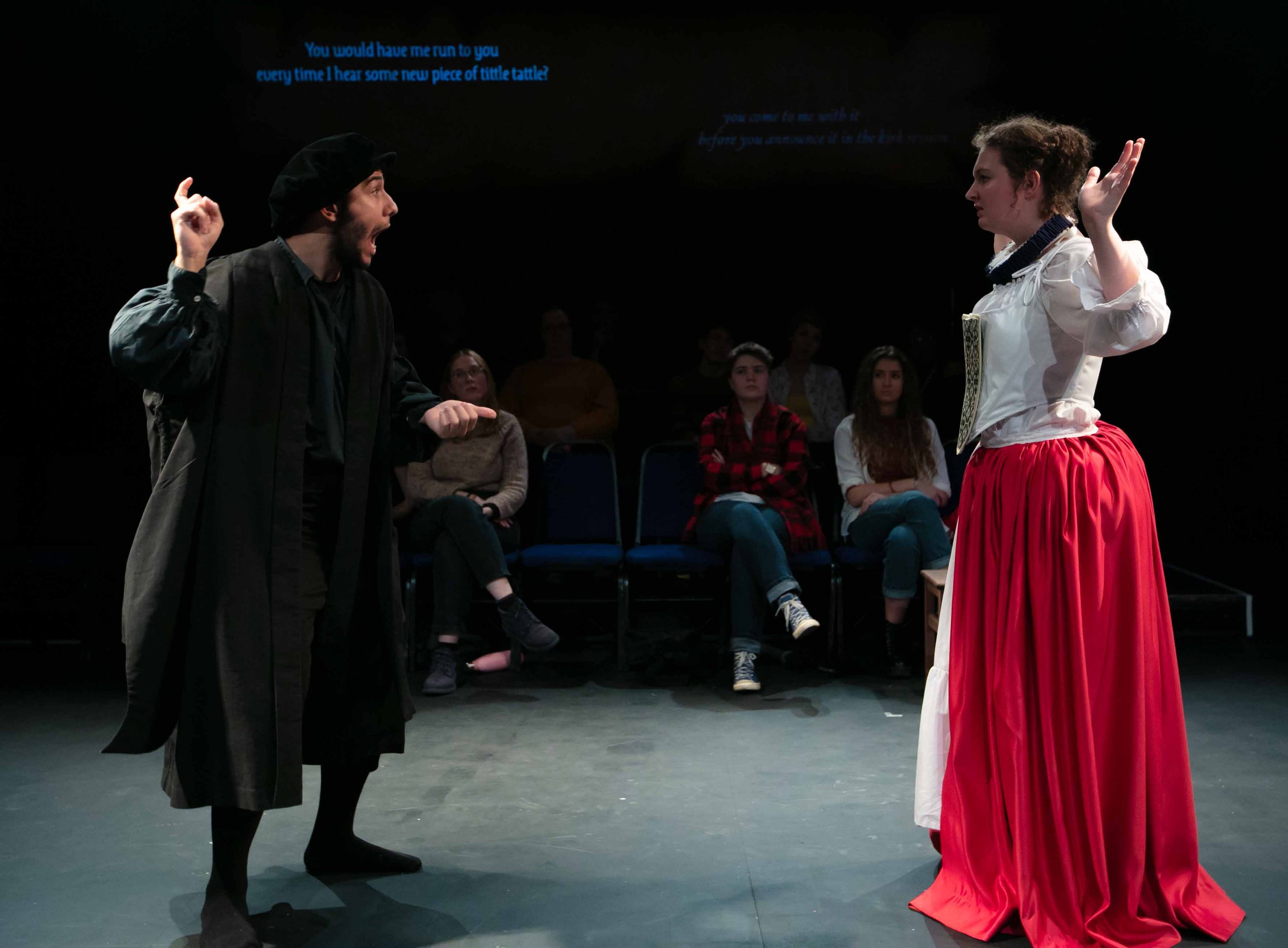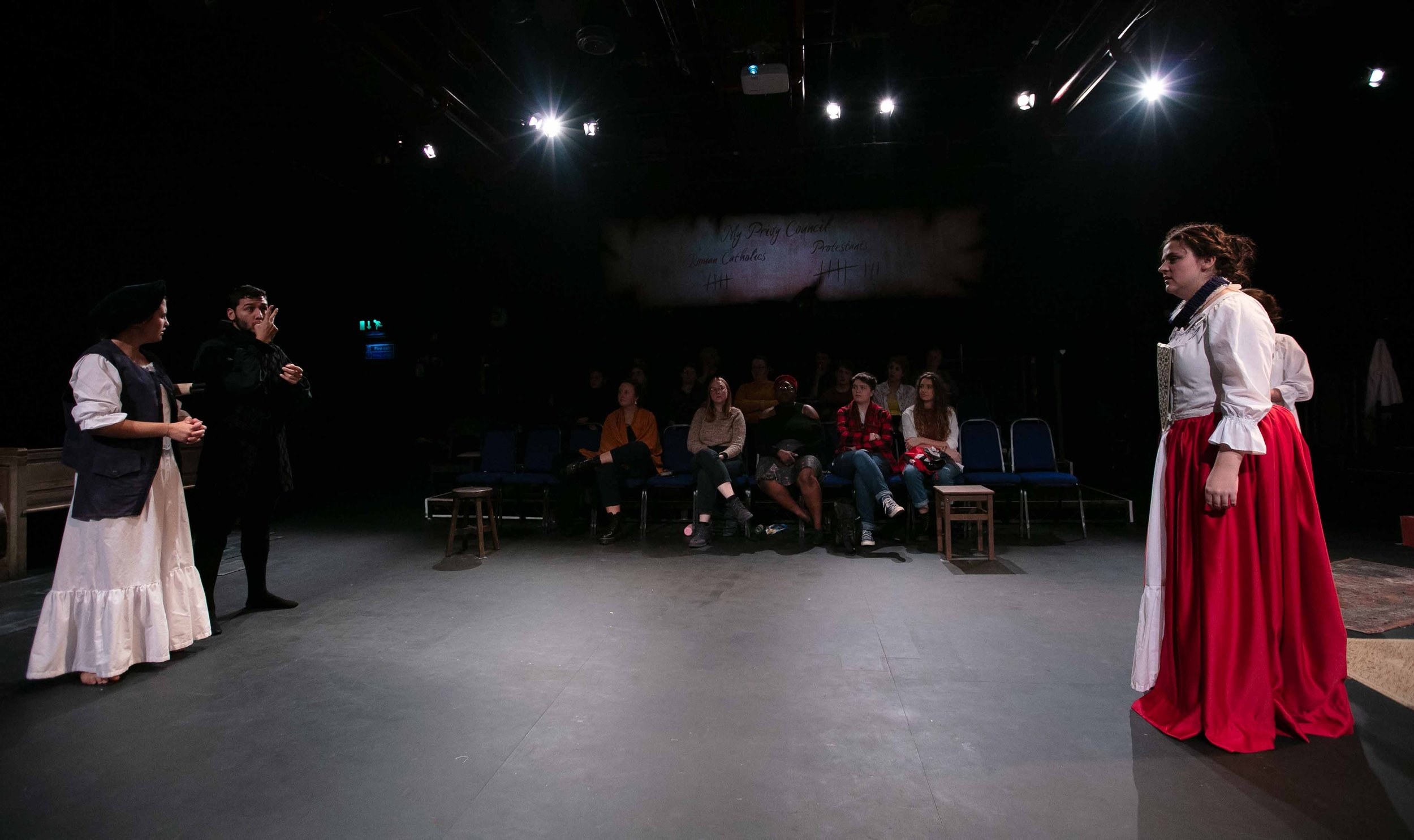 Letters to Bess - a simulated excerpt of the scene. Pictured centre is Queen Elizabeth I (Claire Wetherall). She is facing Mary Queen of Scots across stage as she reads her letter, with her back to Knox, whose letters she also reads in the scene. Original image by Robert McFadzean (silent)
