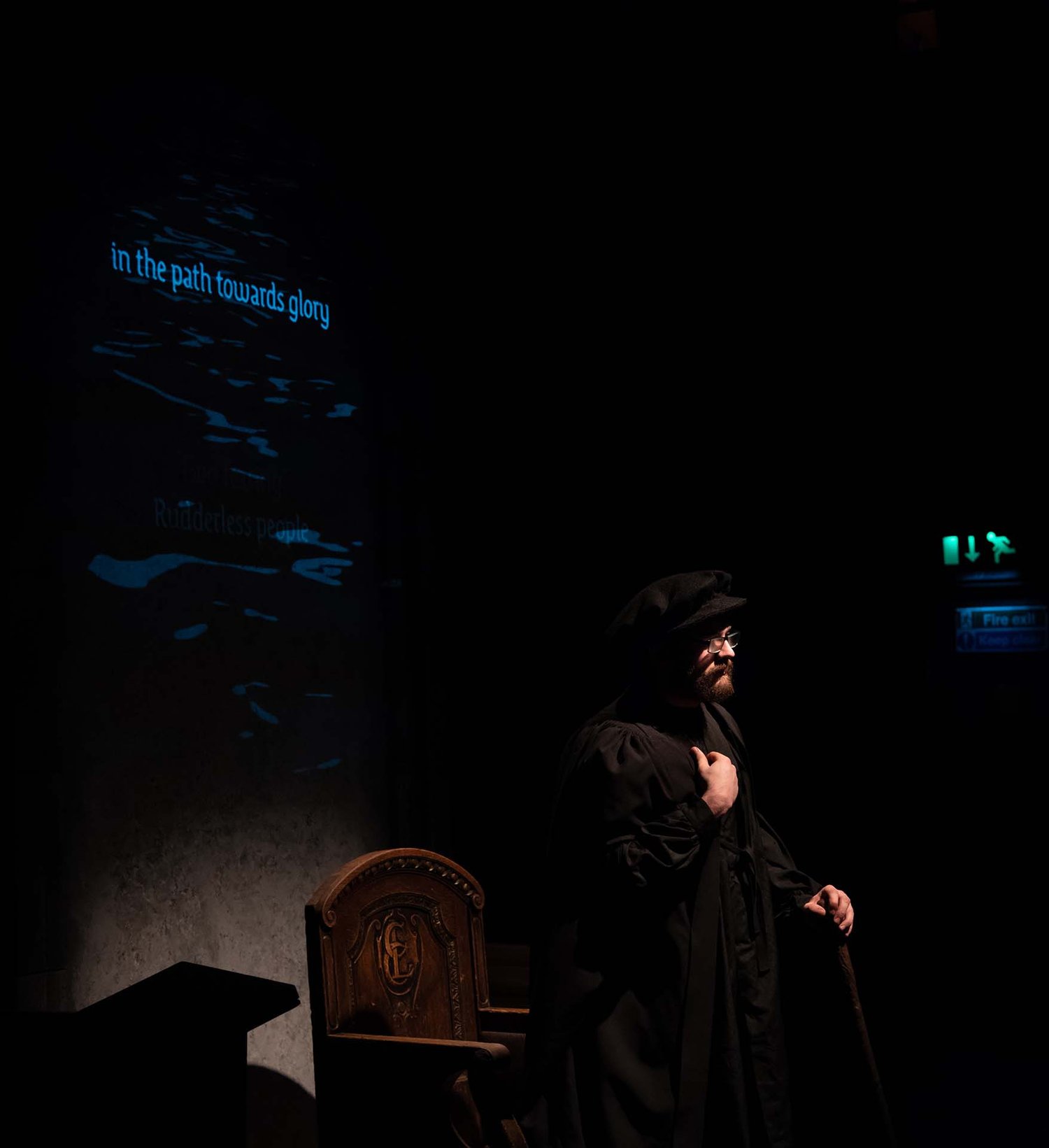Glory on Earth by Linda McLean divulges Mary Queen of Scots’ implacable downfall from her posthumous perspective. She recalls interactions with John Knox, the other Marys, reaching out to Queen Liz, and engaging her Privy Council in an effort to understand what went wrong. Six performances of the play were given in December 2019 in the Chandler Theatre at the Royal Conservatoire of Scotland by the students of the BA Performance in BSL and English course.