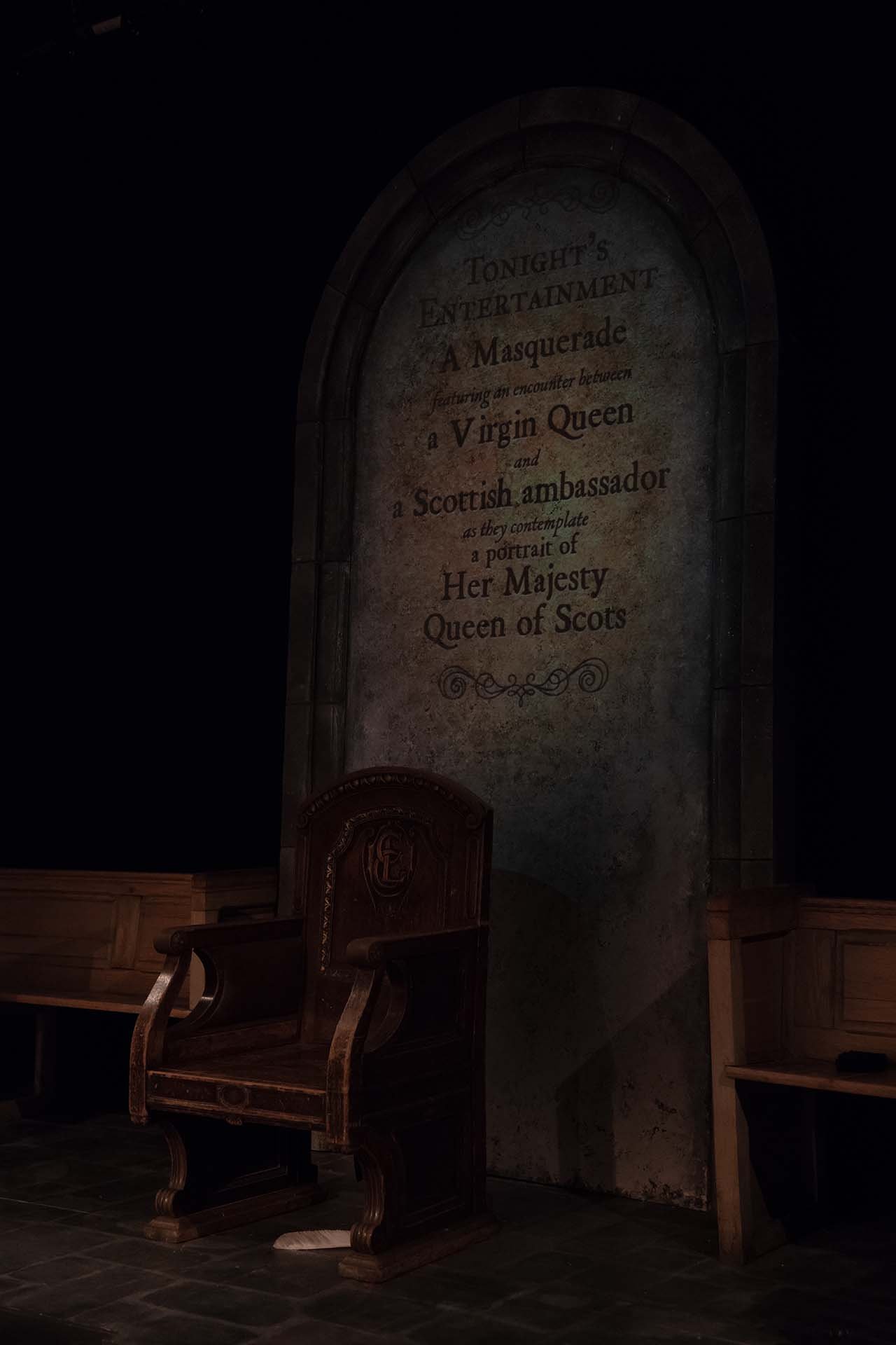 There are some photos of the show, but unfortunately no videos, so I made these “simulations” from the photos to help establish the feeling of the captioning design. Megan Adair designed two beautiful big long pieces of parchment which hang above either side of the audience in traverse, and an archway for Knox which stands downstage. These were our projection surfaces.