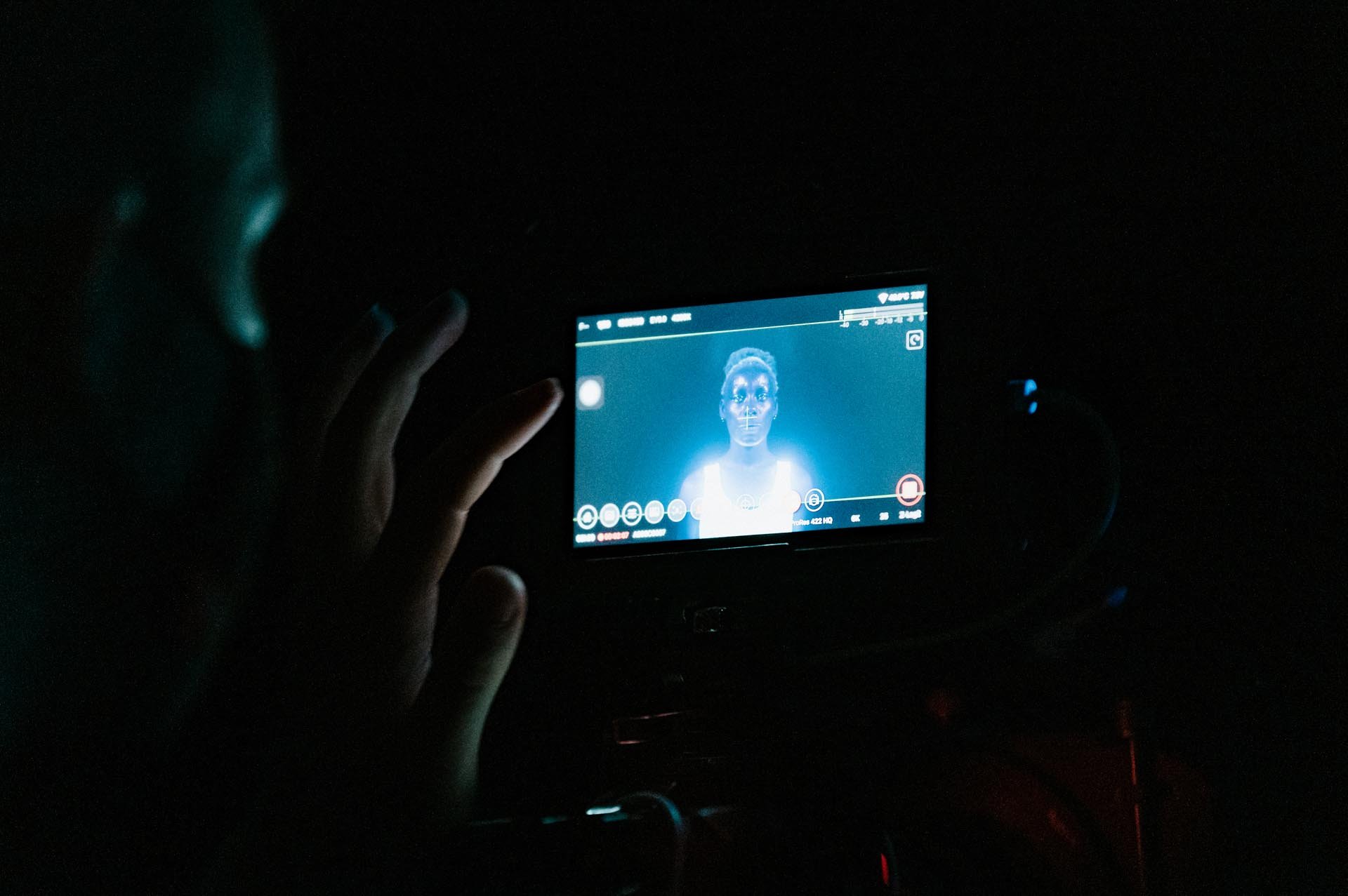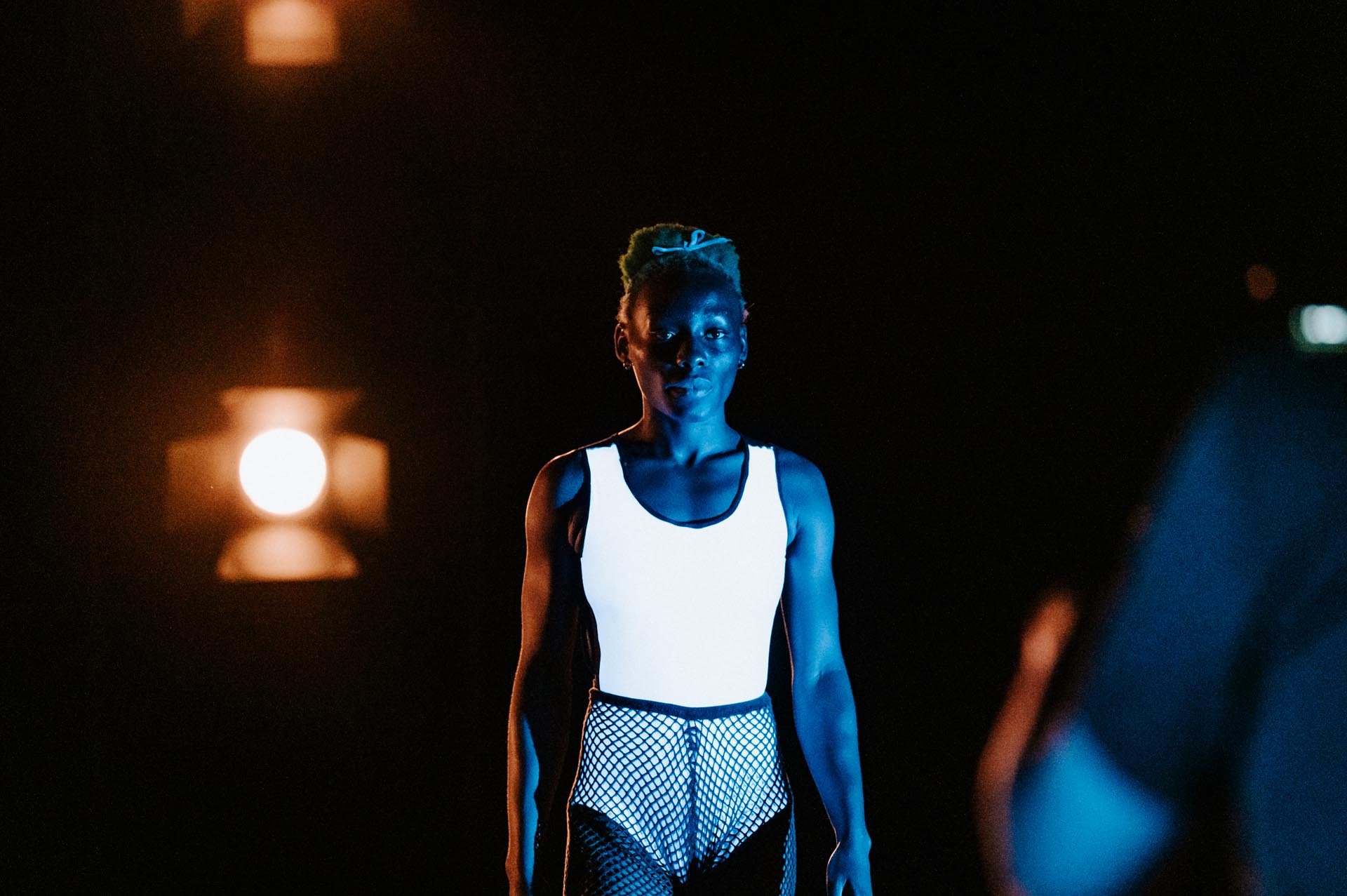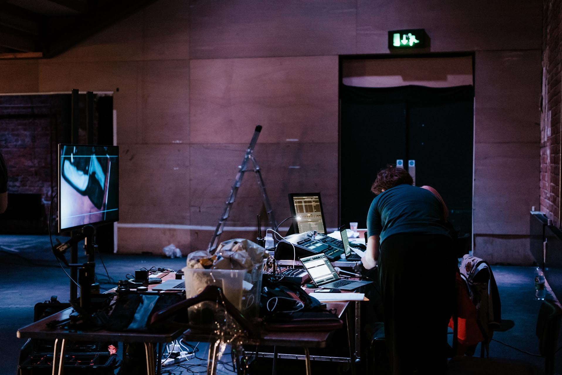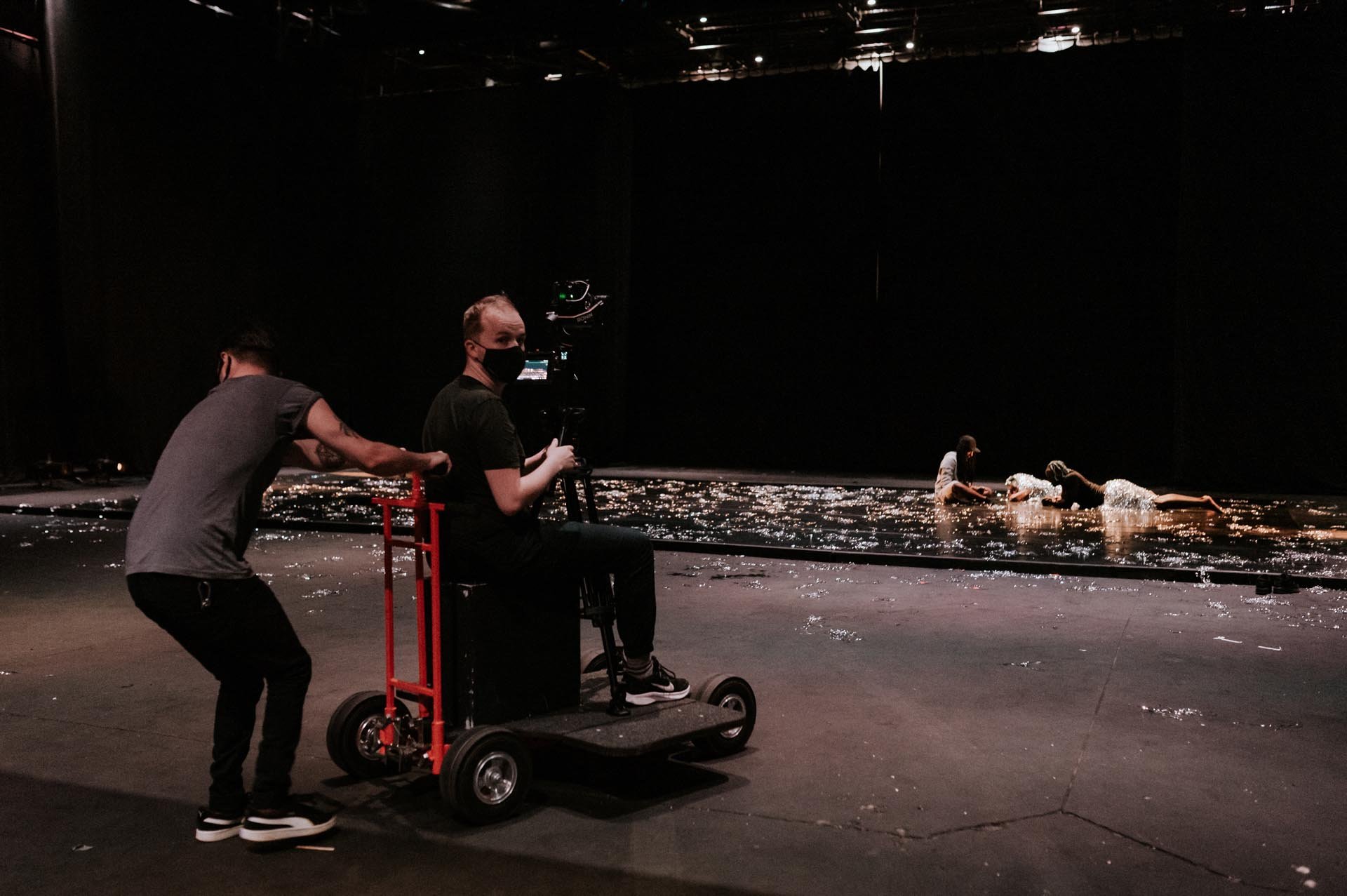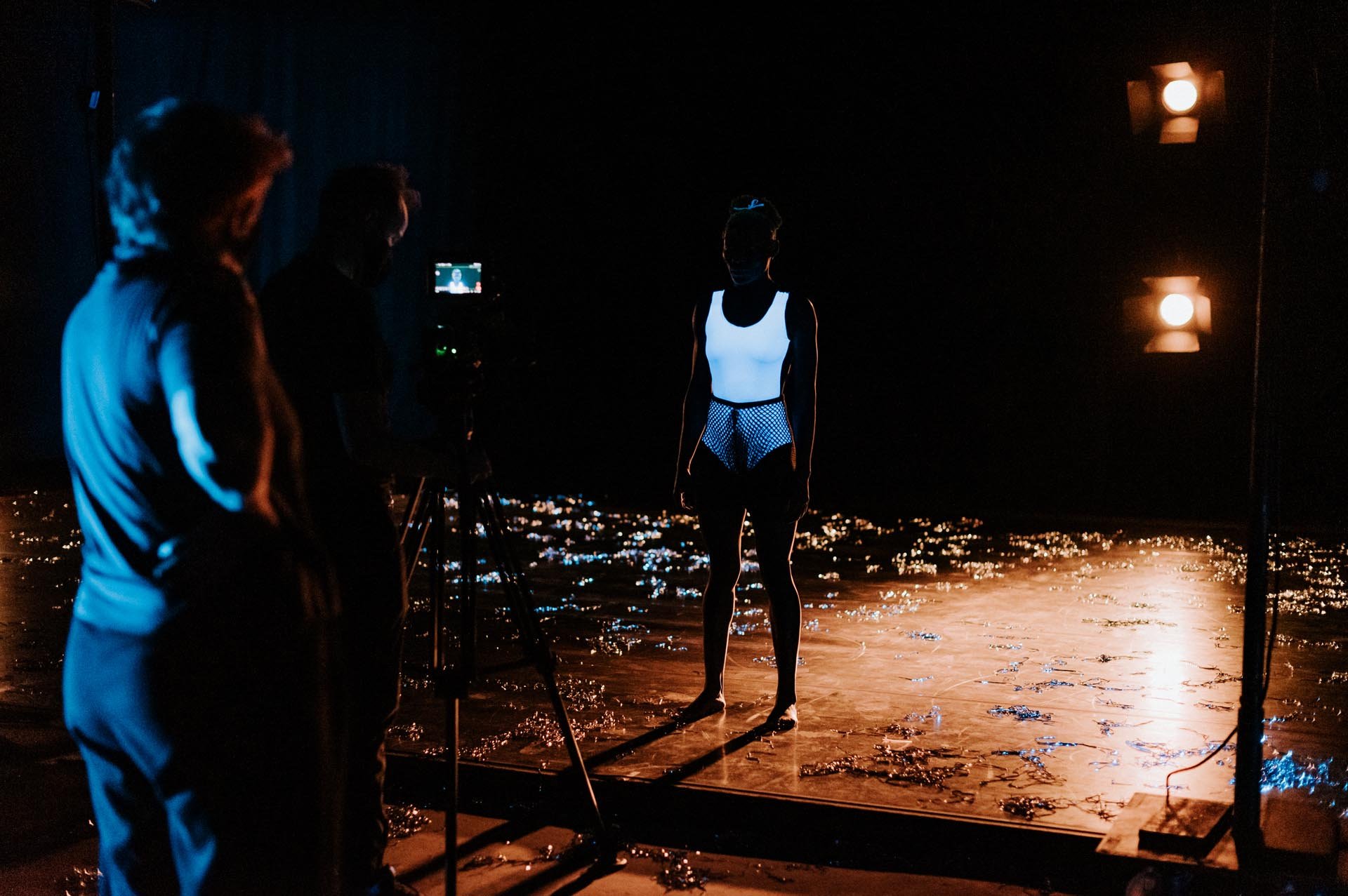 As such, the motivation for each shot or camera movement is questioned and unpicked. Our conversations about the audience’s experience of the live work, and how their focus would shift, would often influence camera movement and positioning decisions. The work itself already explores and subverts gaze in a variety of ways, and the presence of a camera, and its’ perspective, introduces a whole new layer of tangible gaze that we had to make work for us rather than against us. Certain sequences demand respectful distance, others invite a closer gaze, and some intentionally restrict the gaze in a way one might not expect. But even yet, there was still a lot of room for improvisation. Some of the sequences are actually improvised in the moment, in terms of dancing and lighting, so the camera is also improvised here. A contrast of extremely planned, precise shots and very loose, improvised shots lends itself well to the form of the piece as it already existed.