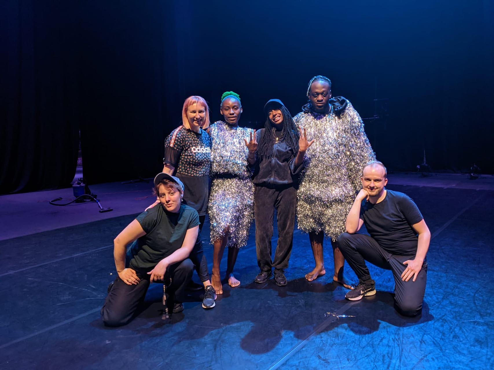 GRIN, a visceral performance of sound, visuals and choreography which subverts hyper sexualised notions of African and Caribbean dance. GRIN is a masquerade of dance sculptures where body and costume are accompanied by a pulsating sound score. Research into community-building, refusals, friendship, support and networks of care grounds the development of GRIN, which both holds and is held by a cohort of friends, including but not restricted to artists and choreographers Mele Broomes, Divine Tasinda and Levent Nyembo. GRIN's significant focus on black love and other experiences of interiority feels essential in considering how we can build empathy and reconstitute networks of solidarity. Structured around generosity and care for audiences and corps, its score resists falling into the realm of a passive spectacle. Instead tensions related to ideas of generosity embedded within performance practices are questioned alongside moments of refusal from the corps. Conversations with Grin’s director and choreographer Mele Broomes are punctuated with expressions of hope - hope that the performance can expand collective dreaming, hope that the work can be generous and caring to both audience and artists and hope that the work can prompt a greater critique into solidarity and anti blackness. These hopes are manifested amply in our multiple experiences of GRIN.