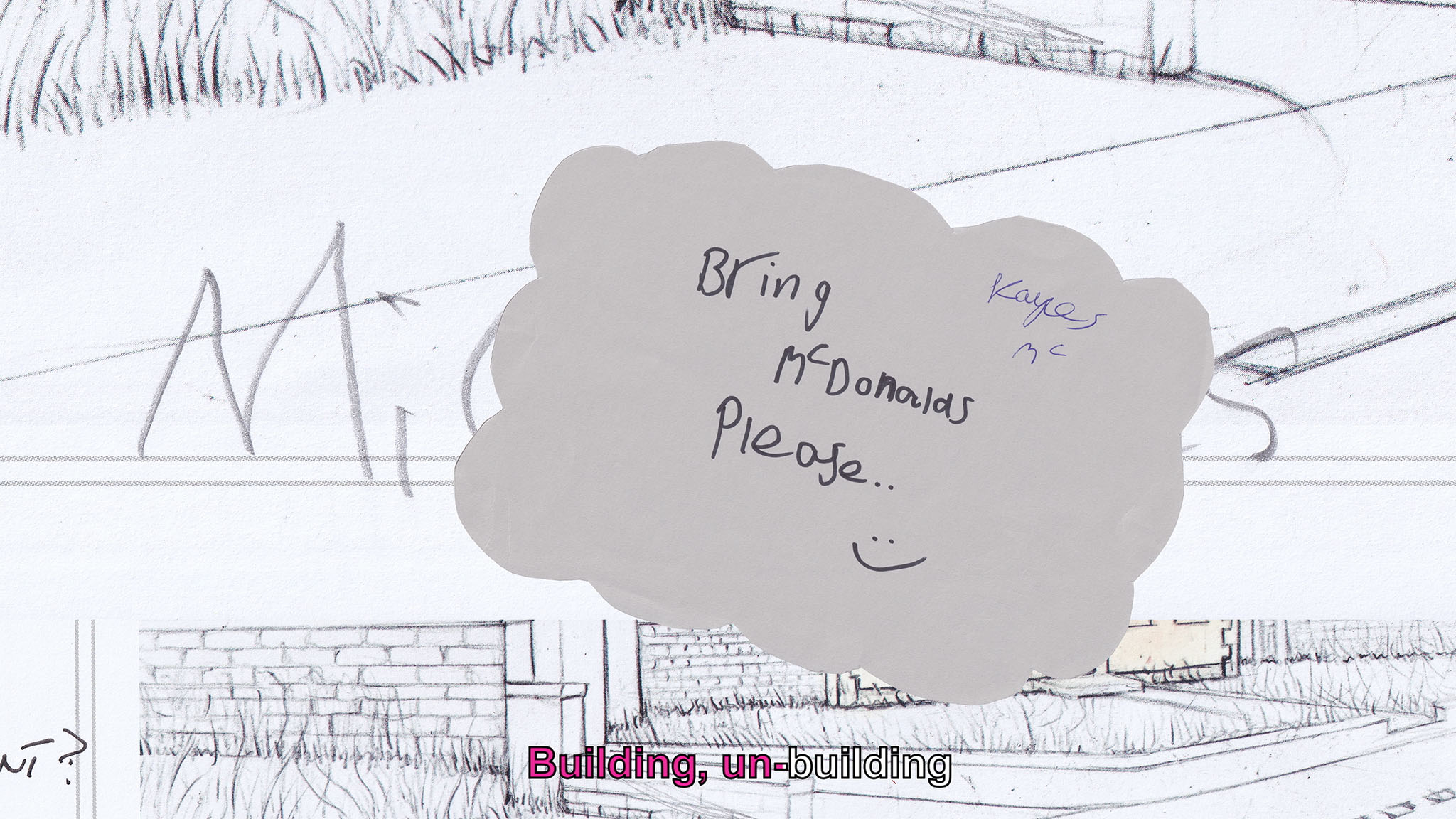 The purpose of the film, we decided, was somewhere along the lines of giving rise to the voices of young people and what they want their town to be, as well as embarrassing whoever it is that is responsible for this gross neglect. We leaned into Dean Munch's “synth crisis” vibe of the “building, un-building” moments to create quite playful but also quite hideous collages of derelict bits of buildings, interwoven with the children's colouring in and notes on what the town’s buildings should be turned into. It was really important to me to let the humour and naïvety of their scribblings come through in playful collages, and to let them be what they are rather than trying to dress it up as something else, or unfairly over-represent that one kid who is “good at drawing”, instead prioritising a fair and unabridged representation of the children’s opinions (even if I wouldn’t want a McDonald’s myself!). Hope then created paper cut outs of different objects and shapes which we used to create the animated sections.